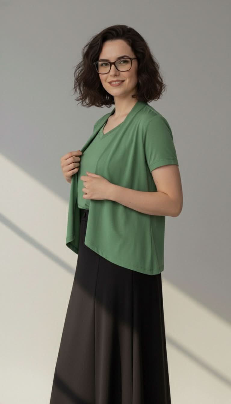 É uma camiseta básica decote V com corte evasê, que não marca + um coletinho que tem todo seu charme e ar contemporâneo! A gente amou! :)