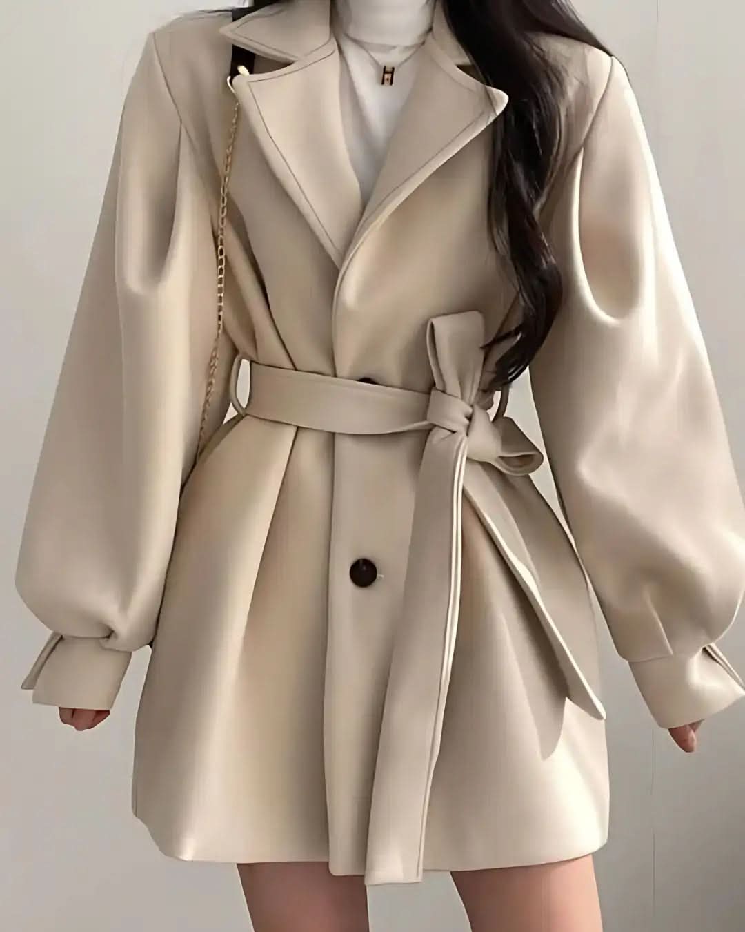 Seu design estruturado conta com modelagem acinturada e mangas longas bufantes, entregando um visual moderno, fashionista e atemporal. Os botões frontais, a gola clássica e o comprimento alongado completam o look com imponência.